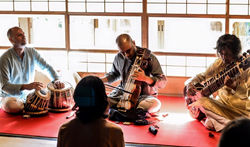 ![]() Gumi (bansuri), Tiko (swarmandal) & Glen in concert, Sangeet Mela, Gifu, Japan 2016 | ![]() HIROS (bansuri), Minamizawa (sitar), Glen (tabla) with Shomyo monks in Kyoto, Jan 2017 | ![]() Glen at Eiun-in temple, Kyoto 18th June 2016 |